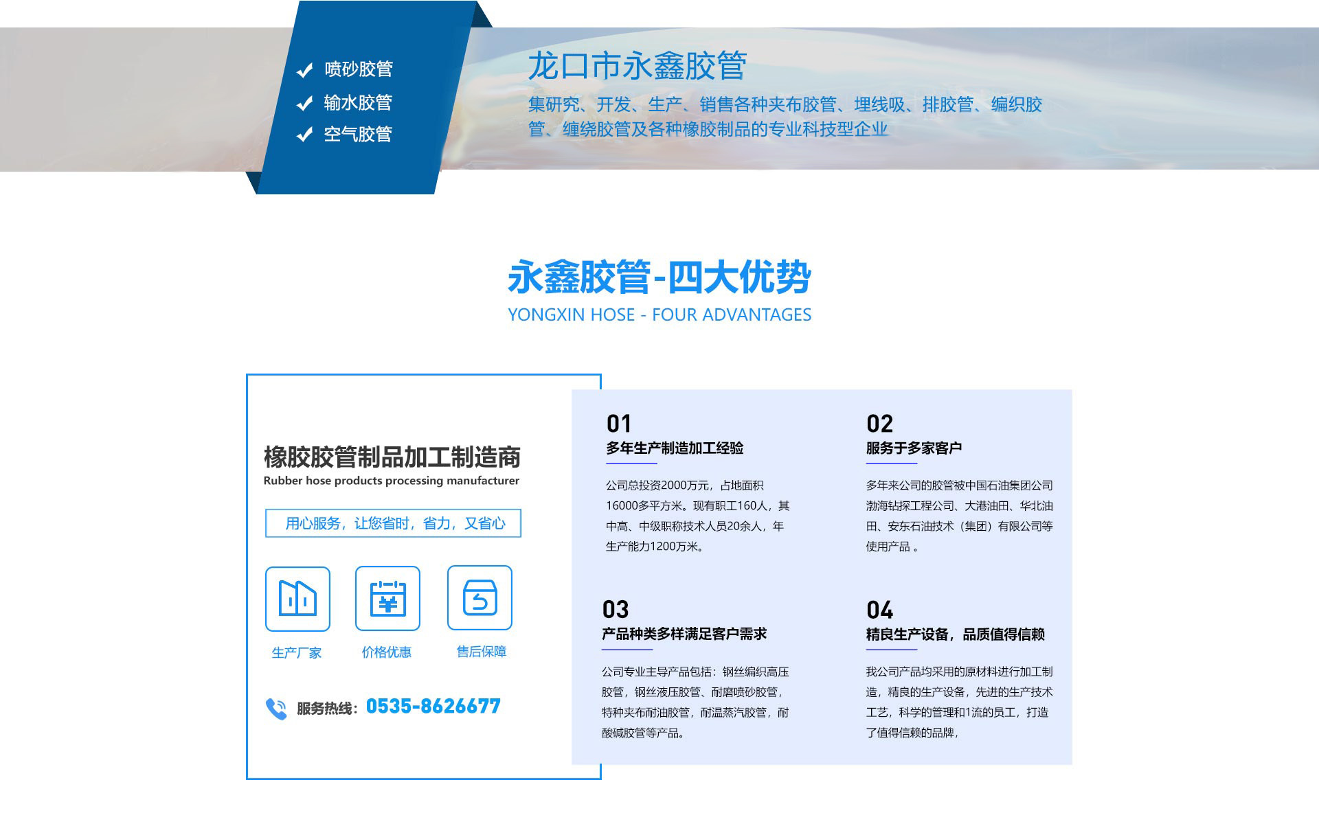 龍口市永鑫膠管有限公司始建于1979年。位于山東半島北端——龍口市,毗鄰龍口港、威烏高速公路和大萊龍鐵路,商業(yè)運輸,交通方便,地理位置好。公司總投資2000萬元,占地面積16000多平方米。現(xiàn)有職工160人,其中高、中級職稱技術(shù)人員20余人,年生產(chǎn)能力1200萬米。多年來公司的膠管被中國石油集團(tuán)公司渤海鉆探工程公司、大港油田、華北油田、安東石油技術(shù)(集團(tuán))有限公司等使用產(chǎn)品我公司迎著十八界三中全會的改革大潮始終闊步向前,目前我公司主要從事高低壓橡膠軟管、鉆探膠管、夾布膠管、噴砂膠管、橡膠管帶制品,等產(chǎn)品的生產(chǎn)和研發(fā),主導(dǎo)產(chǎn)品包括:生產(chǎn),研制高低壓橡膠軟管、輸送皮帶等以橡塑為主的產(chǎn)品,擁有各類進(jìn)口,國產(chǎn)生產(chǎn)設(shè)備120多臺套,化驗,分析,試驗儀器設(shè)備種類多,檢測手段完善。我公司產(chǎn)品均采用的原材料進(jìn)行加工制造,精良的生產(chǎn)設(shè)備和穩(wěn)定技術(shù)工藝,科學(xué)的管理,打造了客戶信任的牌子,先后與多家石油、化工、汽車制造等大型國有企...